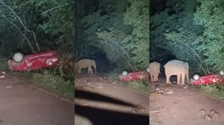 അതിരപ്പിള്ളിയിൽ കാട്ടാനക്കൂട്ടം നിർത്തിയിട്ട കാർ ത...
