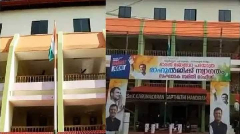 തൃശൂർ ഡി സി സി ഓഫീസിന് ബിജെപി പതാകയുടെ നിറമുള്ള പെ...