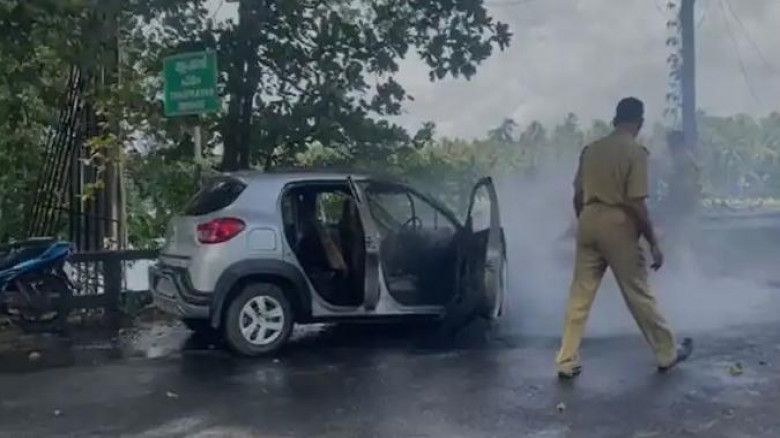 തൃപ്രയാറിൽ ഓടിക്കൊണ്ടിരുന്ന കാറിന് തീപിടിച്ചു, കുട...