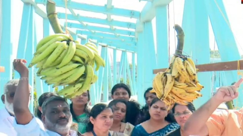 തൃശൂർ ശക്തൻ നഗറിലെ ആകാശ പാതയിൽ വാഴക്കുലകൾ നാട്ടി ക...