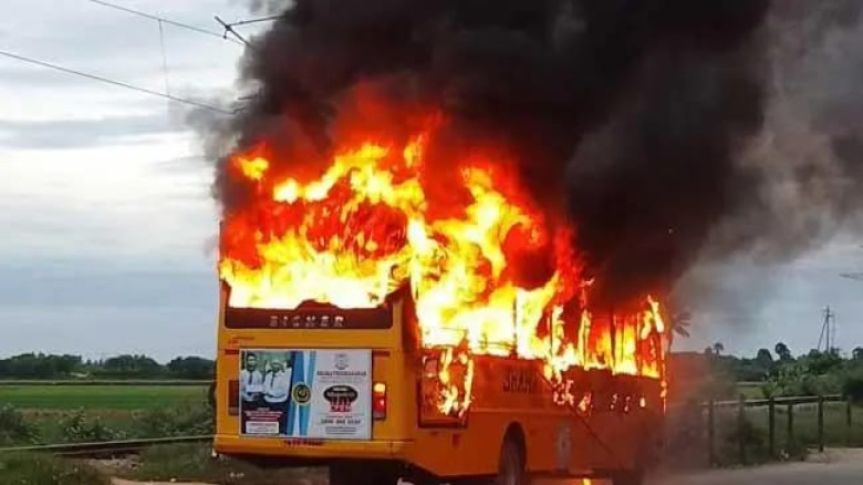 വിദ്യാർഥികളുമായി പോയ സ്കൂൾ ബസിനു തീപി...