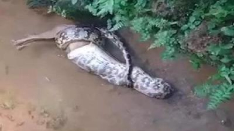 പെരുമ്പാമ്പ് കുറുക്കനെ വിഴുങ്ങിയ നിലയി...