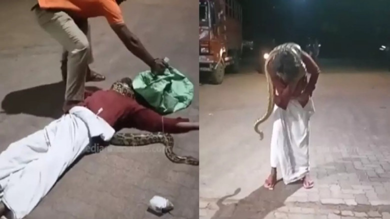 കഴുത്തിൽ പെരുമ്പാമ്പുമായി മദ്യപൻ പെട്രോൾ പമ്പിൽ; ജ...