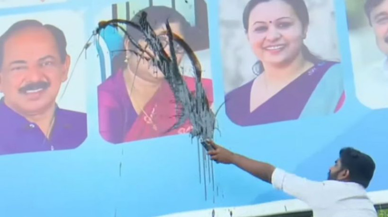മന്ത്രി ആര്.ബിന്ദുവിന്റെ ഫ്ളക്സില് കരി ഓയില് ...