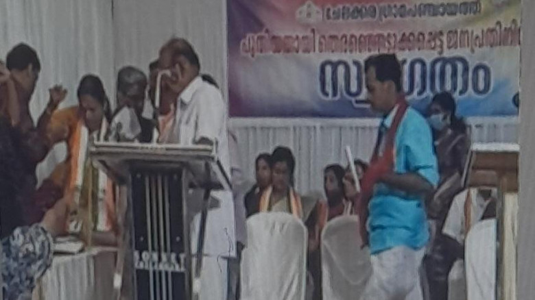 നഗരസഭയിൽ സത്യപ്രതിജ്ഞ ചടങ്ങിനിടെ നി...